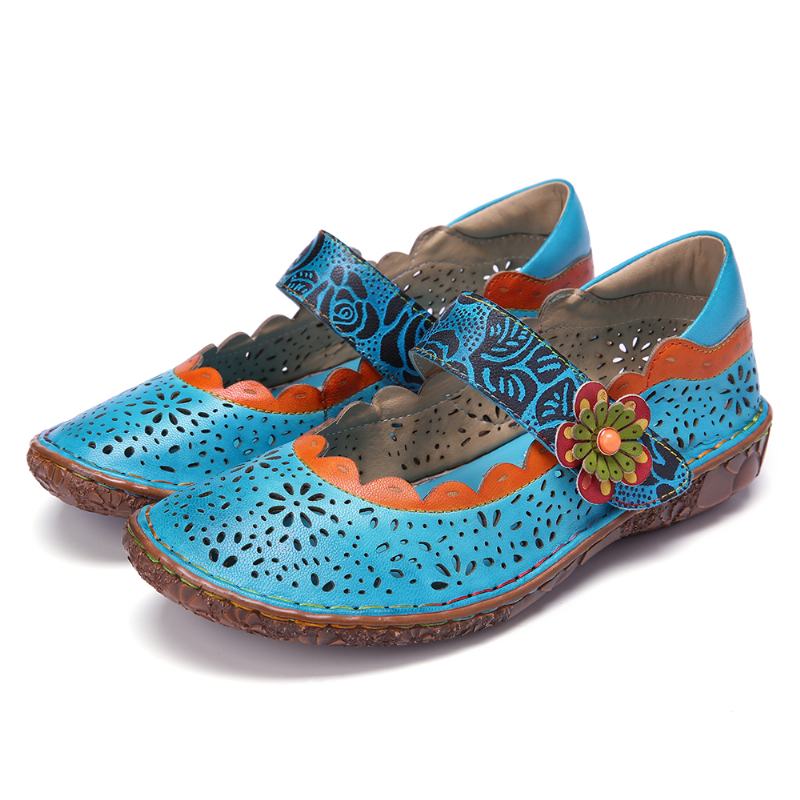 CZeskie Skórzane Kwiatowe Wycięcia Łączenie Miękkiej Podeszwy Flower Hook Loop Flat Shoes