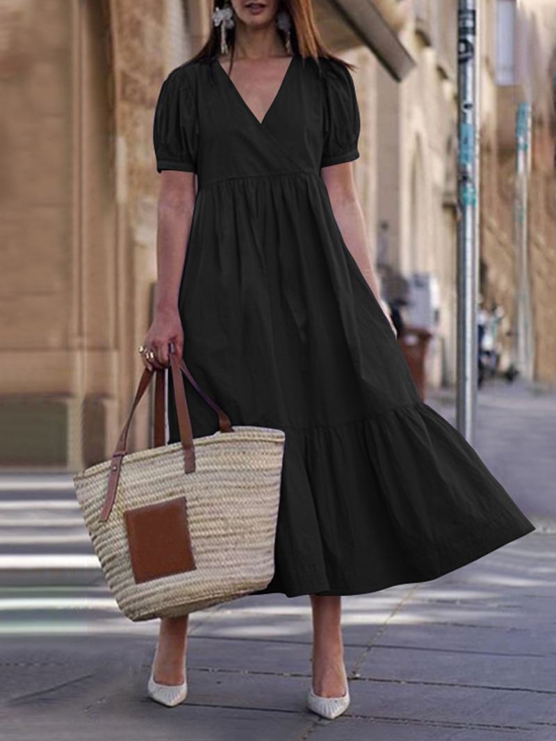Damska Bawełniana Sukienka Maxi Z Dekoltem W Szpic Wakacyjna Plisowana Sukienka Maxi