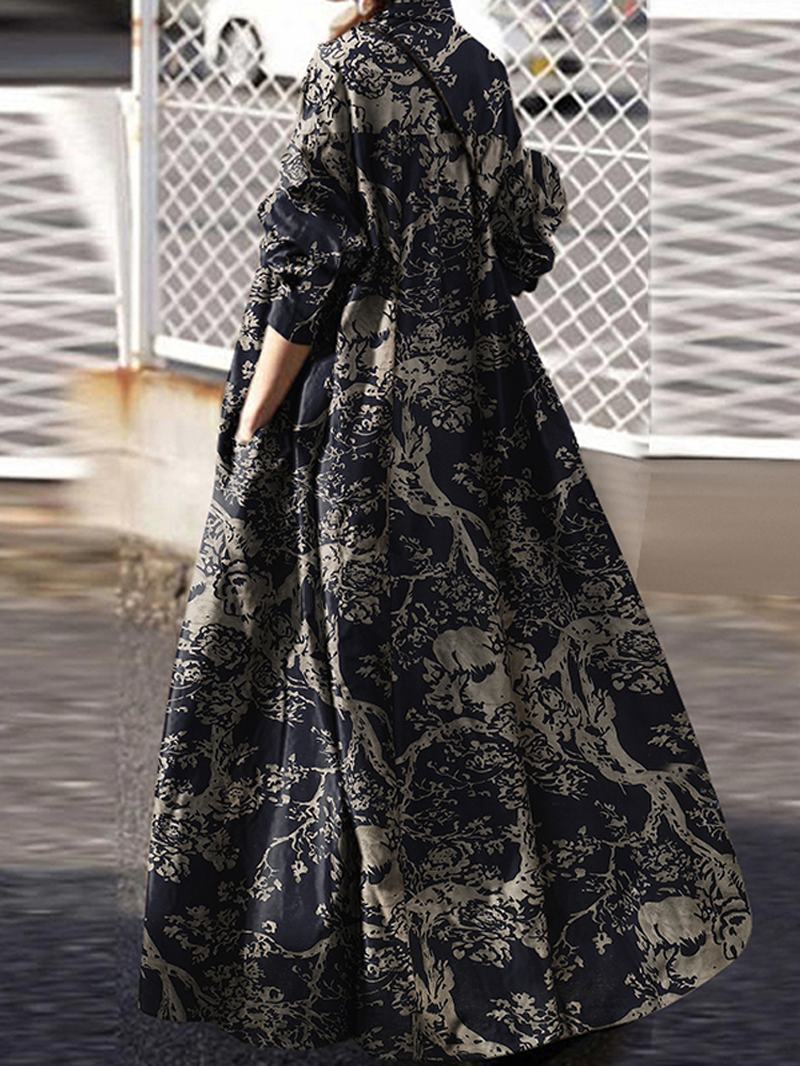 Damska sukienka maxi z długim rękawem i kieszenią w stylu retro z wywijanym kołnierzykiem