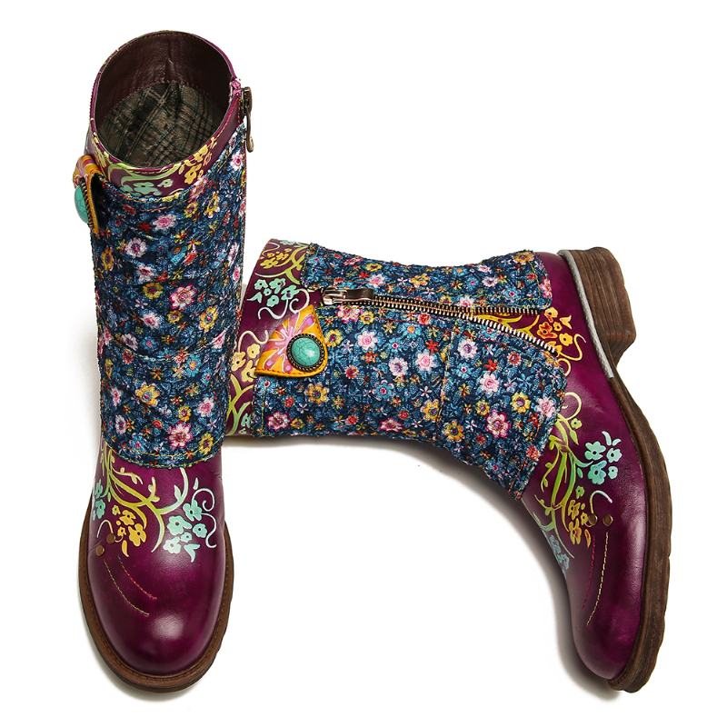 Kobiety Retro Kwiaty Wzór Przeszycia Zipper Płaskie Buty