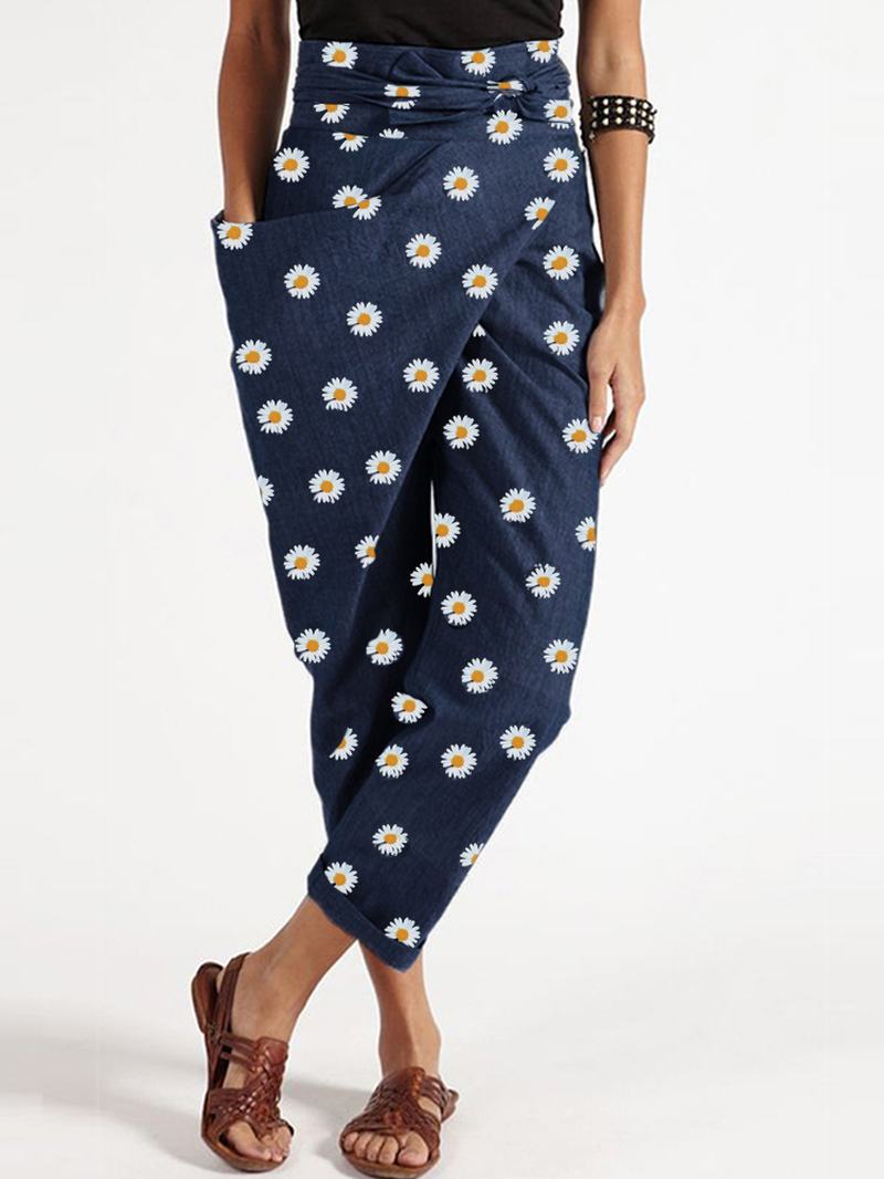Kwiecisty Wzór Z Paskiem Luźne Nieregularne Spodnie Z Kieszeniami Na Zamek Dla Kobiet