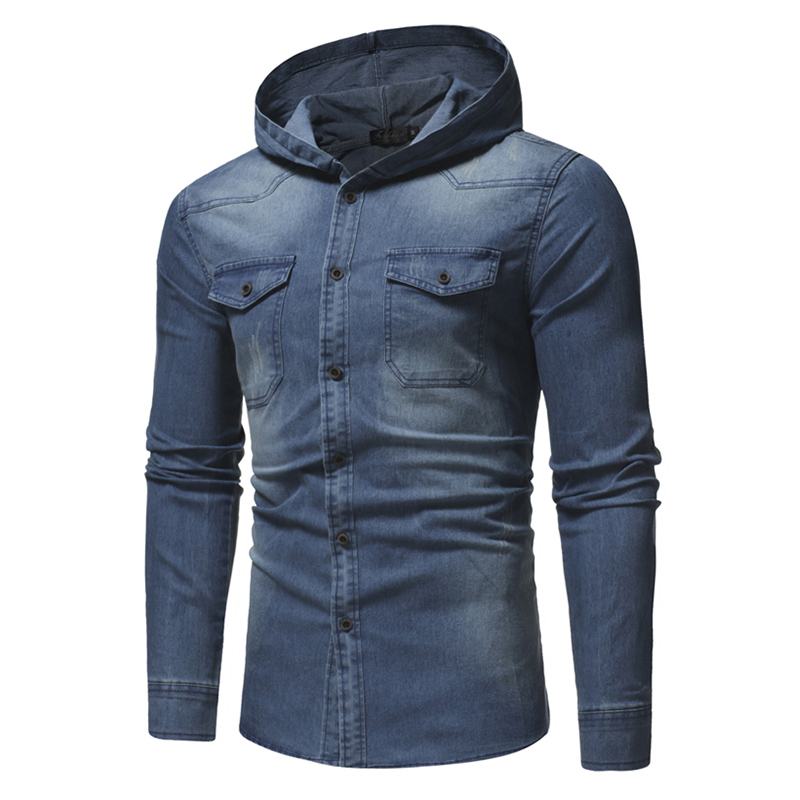 Męska Dżinsowa Kieszeń Na Piersi Bawełniana Koszula Z Kapturem Na Co Dzień