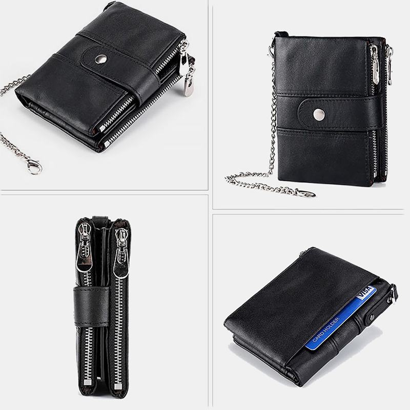 Męska, skórzana, antymagnetyczna kieszeń na karty RFID, jednokolorowa, codzienna, na zamek błyskawiczny, portmonetka z łańcuszkiem