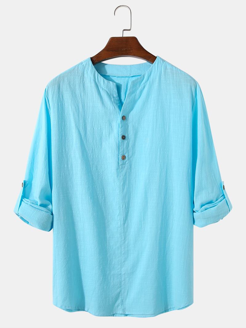 Męskie Bawełniane I Lniane Jednokolorowe Proste Koszule Henley Z Długim Rękawem