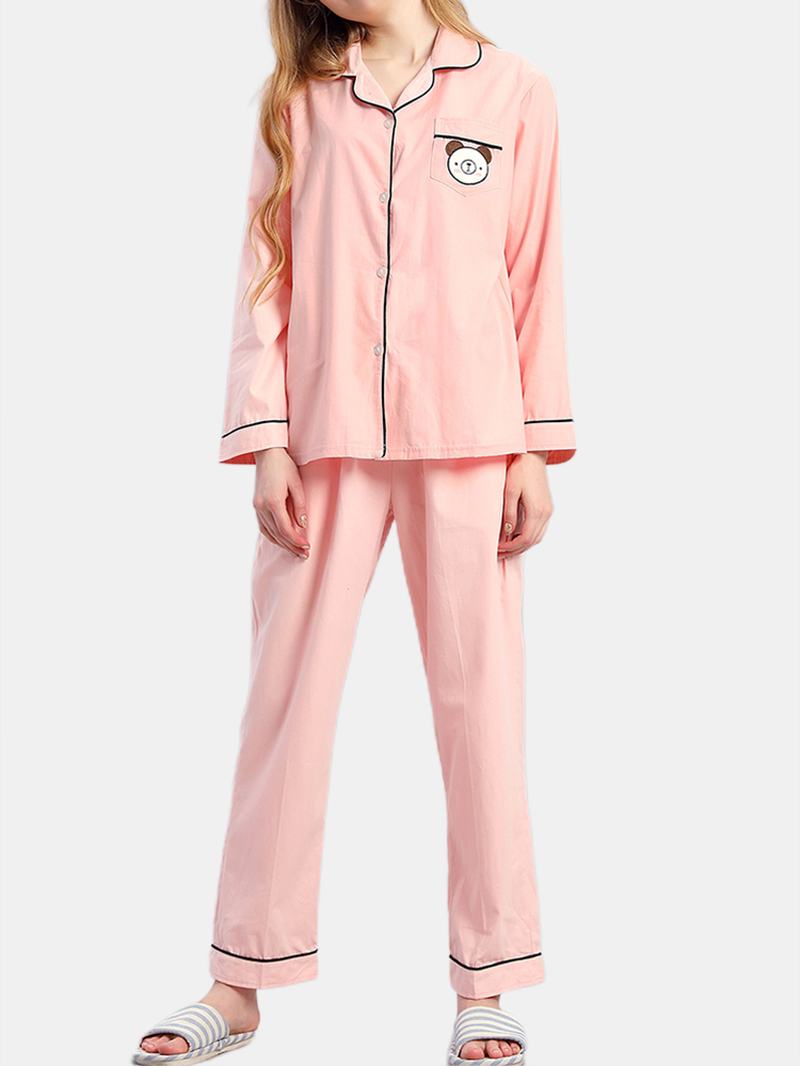 Plus Size Kobiety 100% Bawełna Cartoon Aplikacja Lapel Długie Piżamy Z Kontrastowym Wiązaniem