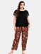 Plus Size Kobiety Koronkowe czarne spodnie z krótkim rękawem Leopard Home Casual Zestaw piżamy