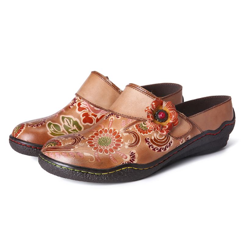 Wygodne buty wsuwane ze skóry w stylu retro z wytłoczonym wzorem w kwiaty